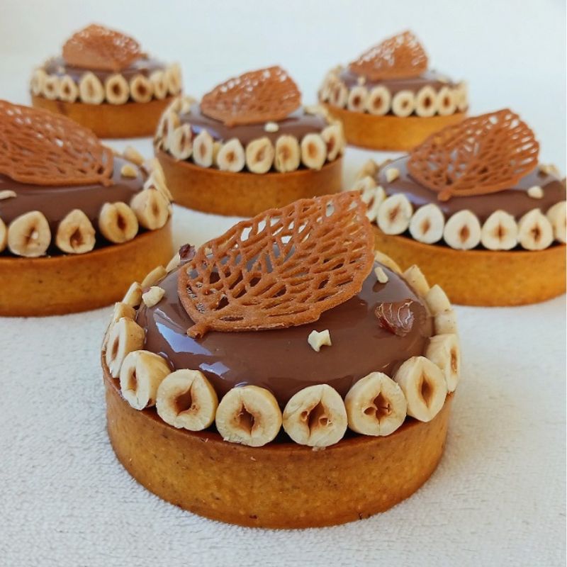 Ces tartelettes se composent d'une pâte sablée, d'un croustillant praliné, d'une dacquoise noisette, d'une ganache chocolat, d'un dôme chocolat et d'un glaçage chocolat.