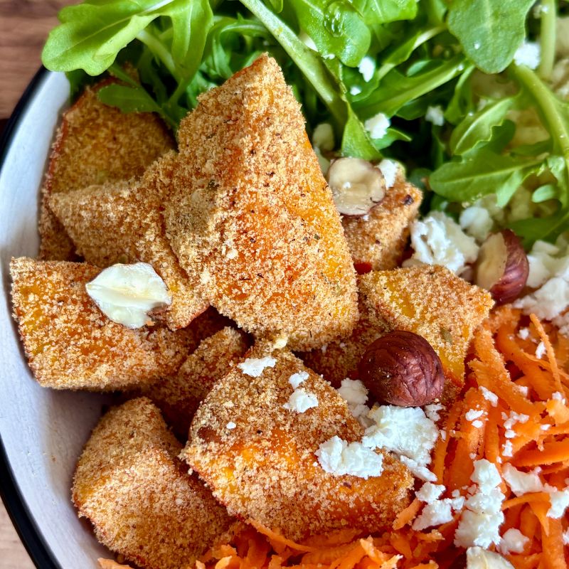 Dans une poêle huilée, verser la chapelure, les noisettes, ajouter le sel et les épices selon vos gouts.